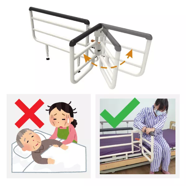 ●護欄向外開啟固定後,可輔助臥床者支撐並協助起身下床