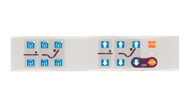 The ACP offers several controls, including bed position adjustment (elevation, backrest, knee, Trendelenburg/Reverse Trendelenburg, and chair positions). It also has a lockout function to prevent accidental use and a button for electric CPR and auto-regression.