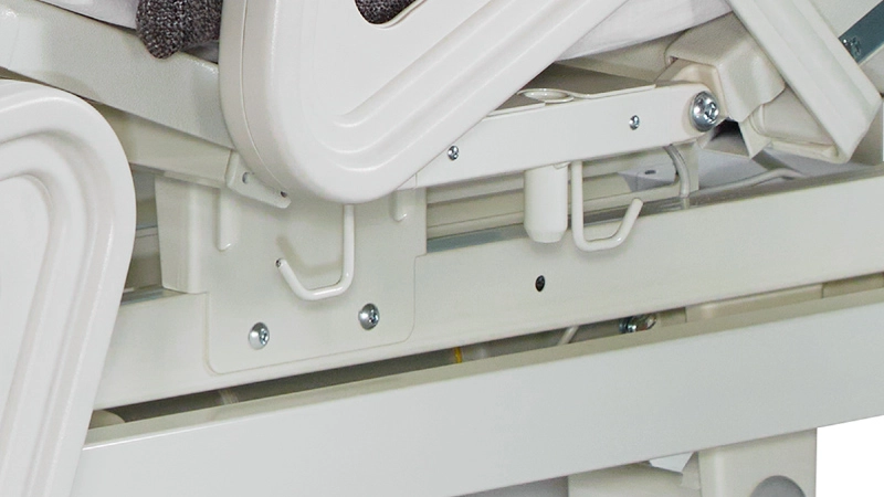 Drainage bag hooks are equipped on the side of the bed, allowing for the secure attachment and hanging of drainage bags to keep the surrounding area clean and organized.