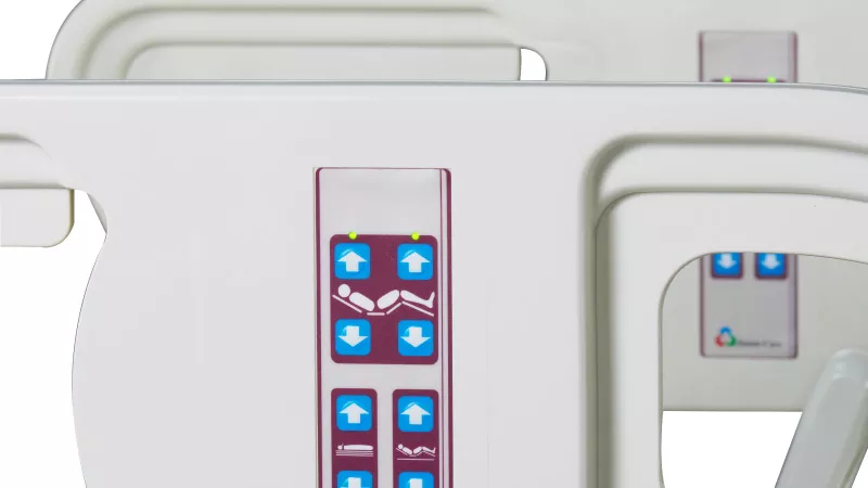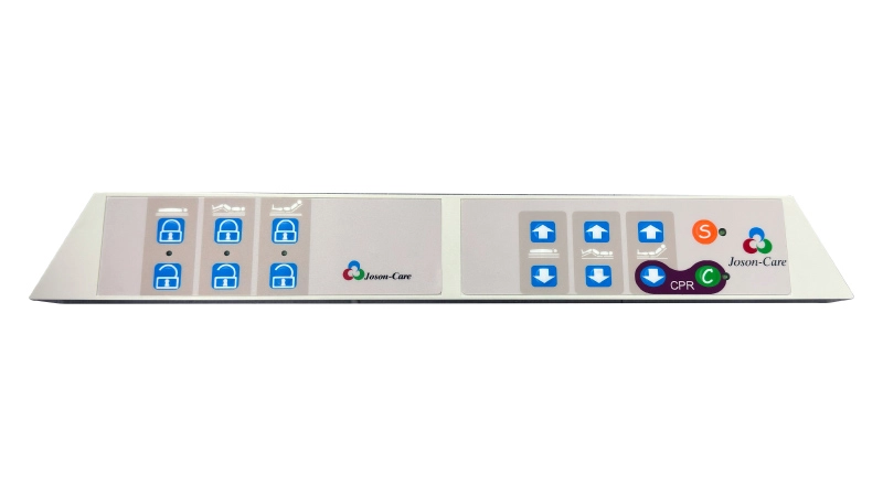 The control panel provides medical staff with controls for bed height, back and knee tilt angle, guardrail button lock/unlock, and CPR quick release button.