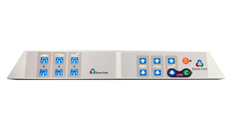 The control panel provides medical staff with controls for bed height, back and knee tilt angle, guardrail button lock/unlock, and CPR quick release button.