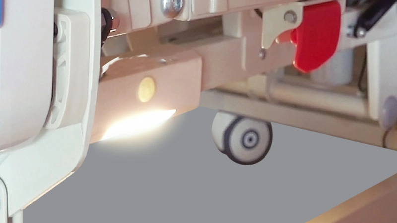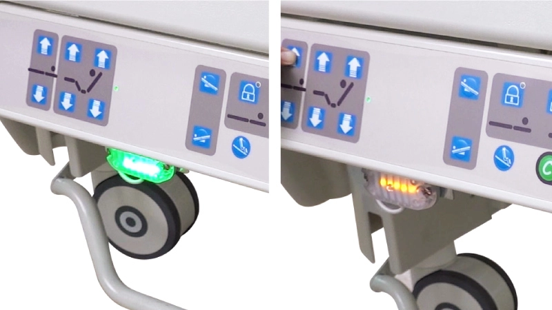 يوجد ضوء مؤشر للارتفاع والفرملة في نهاية قدم السرير. يوفر تحذيرات فورية عند تعديل ارتفاع السرير أو تحريكه، مما يعزز السلامة لكل من المرضى والموظفين.