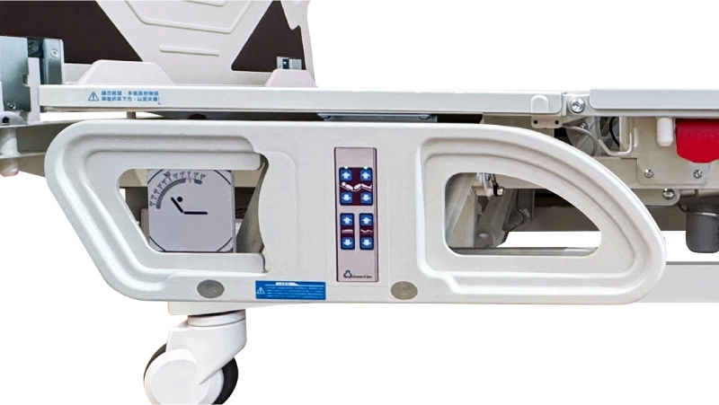 供醫護人員進行操控使用,包含床面高低、背膝部升降、護欄按鍵功能鎖定/解除、CPR快速釋放鍵。