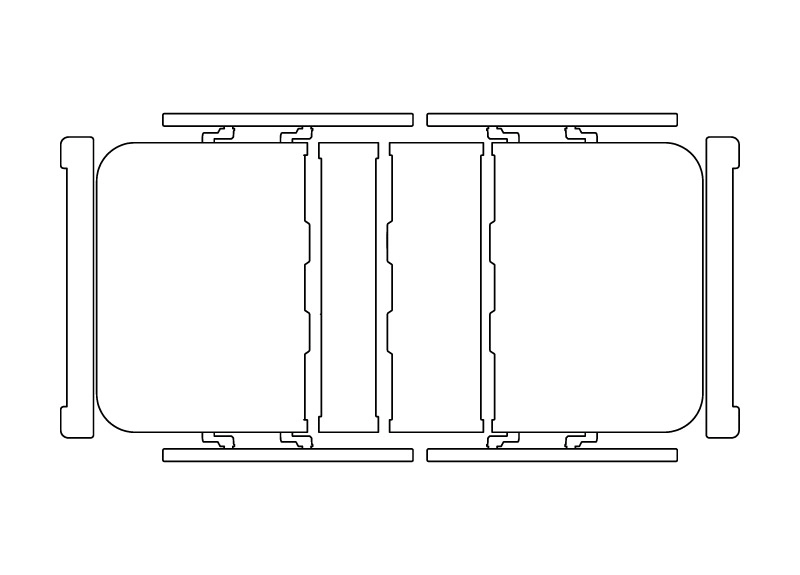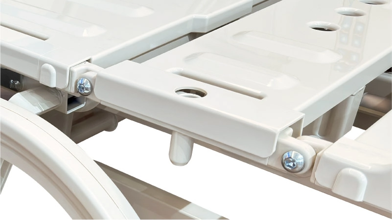 材質為塑鋼一體成型,於其左右兩側設置紅色安全開關,提供快速拆裝,並增加安全性;左右側設置把手,便於拆卸時提握及易於施力移動床體。