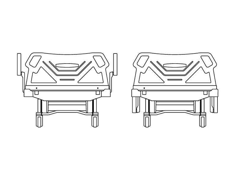 旋轉式護欄設計,兩側護欄提供防止跌落的防護,材質為塑鋼一體成型。可將護欄收合於床底,使輪椅更靠近床緣,讓照顧者與被照顧者便於床邊移動。
