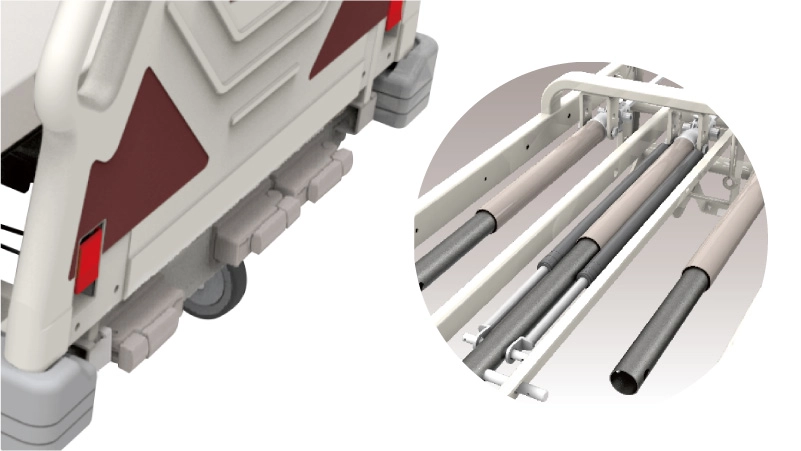 - 透過氣壓缸裝置,大幅減輕手搖操作時所需的力量,讓調整床面變得更輕鬆、更省力